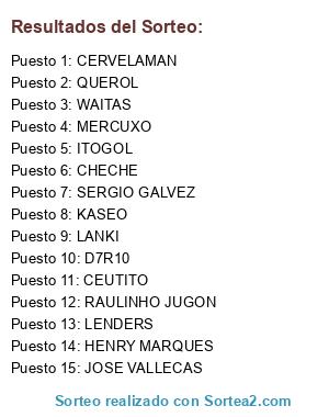 Lista de participantes: CERVELAMAN, CEUTITO, CHECHE, D7R10, HENRY MARQUES, ITOGOL, JOSE VALLECAS, KASEO, LANKI, LENDERS, MERCUXO, QUEROL, RAULINHO JUGON, SERGIO GALVEZ, WAITAS.