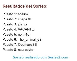Lista de participantes: noir_46, The_animal_69, OoamaroSS, scalin7, chape30, juanpi, neurobyte, VACANTE.