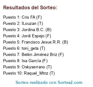 Lista de participantes: AntonioBracero (T), tururutwi (T), ILouzan (T), toni_geta (T), atrujilloluque (T), javi_v_m (T), ElSorteator (T), Silvia_Miquel (T), chamorromj (T), cochinilodulce (T), joserrapoulo (T), Raquel_Mtnz (T), MrJavimarin (T), unkado (T), alnavart (T), Davidm21_ (T), Rafa_Partida (T), panedu (T), adrinone (T), JaVToS_ (T), mister_deis (T), carbur85 (T), truta_man (T), colosuperpower (T), highfredo (T), KarmaGabi (T), SergiRodriguez7 (T), Oskyserrano (T), jordiespejo (T), jmpeiroa (T), Alvaro_mute (T), MariaAlfaro92 (T), satyne21 (T), Questtimes (T), littlelyshue (T), makarey8 (T), alexxguetta (T), Cris FA (F), Javier de la Torre (F), Eduardo Pando Escudero (F), Javier Velardiez Moreno (F), Isa García (F), Alvaro Contreras del Barrio (F), Jordi Espejo (F), Eva Marquez Holguera (F), Alex Silva (F), Paula BM (F), Toni Llebaria Seoane (F), Jordina Balagué Costa (F), Javier Osuna Felipe (F), Sergy Di Trevi (F), Antonio Almazán (F), Dani FerBel (F), Pauli Txups (F), María Black (F), Andrea Flores Echandia (F), Reichel Ita (F), Belén Jiménez Briz (F), Lucía (B), Alex Silva (B), Manuel (B), Alejandro (B), Marcos (B), María García (B), Francisco Jesus R.R. (B), Oscar Alonso (B), Sergi (B), Oscar (B), Highfredo (B), konfusiom (B), Jordina B.C. (B), Toni L.S. (B), Ariel M (B), Eduardo (B), Mrjavimarin (B), Antonio (B).