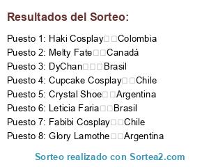 Lista de participantes: Crystal Shoe Argentina, Glory Lamothe Argentina, DyChan Brasil, Leticia Faria Brasil, Melty Fate Canadá, Cupcake Cosplay Chile, Fabibi Cosplay Chile, Haki Cosplay Colombia.