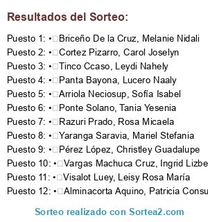 Lista de participantes: • Alminacorta Aquino, Patricia Consuelo, • Arriola Neciosup, Sofía Isabel, • Briceño De la Cruz, Melanie Nidali, • Cortez Pizarro, Carol Joselyn, • Panta Bayona, Lucero Naaly, • Pérez López, Christley Guadalupe, • Ponte Solano, Tania Yesenia, • Razuri Prado, Rosa Micaela, • Tinco Ccaso, Leydi Nahely, • Vargas Machuca Cruz, Ingrid Lizbeth, • Visalot Luey, Leisy Rosa María, • Yaranga Saravia, Mariel Stefania.