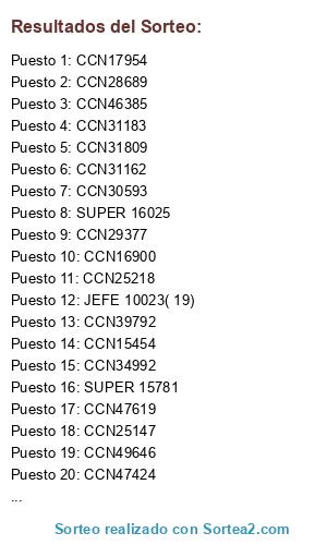 Lista de participantes: CCN15454 (28 participaciones), CCN16900 (33 participaciones), CCN17954 (22 participaciones), CCN21591 (21 participaciones), CCN25147 (16 participaciones), CCN25218 (27 participaciones), CCN28689 (31 participaciones), CCN29377 (39 participaciones), CCN30593 (26 participaciones), CCN31162 (21 participaciones), CCN31183 (24 participaciones), CCN31252 (30 participaciones), CCN31809 (10 participaciones), CCN34992 (28 participaciones), CCN35217 (20 participaciones), CCN39792 (43 participaciones), CCN46385 (62 participaciones), CCN47424 (21 participaciones), CCN47619 (53 participaciones), CCN49646 (24 participaciones), JEFE 10023( 19), SUPER 16025 (19 participaciones), SUPER 15781 (18 participaciones), SUPER 15781.