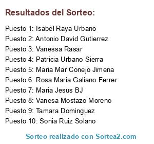 Lista de participantes: Rocio Herrada Hz, Silvia Fuertes, Angeles Rentero, Rosa MarÃa Rosa Castillo, M Gloria CalPin, Vanessa Arjona Toledo, Janet Camacho, Sandra Palma, Isabel Gonzalez, Lorena Echevarria, Patricia Portillo Marfil, Carmen Jeannette Sanchez, Rosa Maria Carnero Jerez, Marisa Cerezo P, Ana Rodriguez Pino, Pilar Maroto Diaz, Tamara Diaz Gonzalez, Raquel Zorrilla Atencia, Sergio Garcia Caro, Alicia Lopez Carmona, Maty Jesus, Censi Galvez, Cristina Sirvent Aragón, Virginia Pascual Cerdera, Miriam Velasco Diaz, Vanessa M Castillo, Eva Gonzalez Marfil, Rocio Doblas Ferrer, Rocio Ravira Perez, Escarlata Perez Piña, Noemi Gonzalez Alcoba, Ani Garrido Rodriguez, Mel Fer, Rosa Bueno, Sari Ruiz Garcia, Jose Francisco Gutierrez Navarro, Jessica Muñoz Araujo, Lorena Ruiz Maroto, Ana Padilla, Nanda Plena Felicidad, Prado Carretero Blanco, Paula Garcia Romero, Maria Carmona, Ana Maria Medina Plaza, Isa Jimenez, Esther Jimenez Muñoz, Elvira Romero González, Carmen Eva Gil, La Esme B V, Sonia Melgares Bustamante, Angeles Valdivia Sanchez, Estela Castilla, Romero Ortigosa Toñi, Silvia Guillen Galan, Vanessa Poveda, Auxi CAmpos, Silvia Be, Sonia Lopez Gonzalez, Francisco Gomez Berdugo, Amber Aguilera, Andrea Palomo, Ana Reina Luque, Angel de la Torre, Brenda Maldonado Rodriguez, Estefania Orellana Vargas, Chabe Romero, Estela Negrete, Angela Garcia Vazquez, Patricia Briones Ruiz, Alejandro Luque Calzado, Ana MartÃn, Verónica Ruiz Molina, Juan Carlos Recio Candelas, Maria Remedios MartÃn Raya, Victoria Ana Soler GarcÃa, Vanessa Ruiz, Charo Morejon, Isabel Martin, Lolilla Santiago Alcoholado, Beatriz Gaitan Maldonado, Marisa Navarro, Isabel Rico Sagarzazu, Vanesa Mostazo Moreno, Zoraida G. Leon, Elisabet Cañadas Lopez, Rocio Lanzas Rico, Marivi Pallarés, Myriam Garrido Diaz, Marian Versace, Diana Rieber, Elena Garcia Parra, Victoria Gutierrez Rodriguez, Rosi Bravo Arcas, Maite Perales Martin, Patricia Gonzalez Cazorla, Almudena FrÃas Arjona, Lourdes Sedeño Carvajal, Paula Jimenez, Ana Segovia Gil, Emilio Melgarejo Gutiérrez, Yami De La Cruz, Rocio Vargas, Irene Vallejo, Rosa Maria Galiano Ferrer, Yolanda Vera Redondo, Carmen Marina Perez Bernal, Susana Lopez Martin, Nerea Lima Grande, Margui Diaz, Patri Villalba Gomez, Raquel Blanco, Maria Lincas, Inma Triano Muñoz, MarÃa Auxiliadora Romero Santos, Nati Dominguez, Alicia MartÃn Fernández, Juan Carlos Rojas Vela, Veronica Pequeño Lopez, Antonia Moyano, Maria Dolores Dominguez, Lorena Muñoz Fernández, Luci Moyano, Carlos Javier R, Carmen Ponce Romo, Sandra Celia, Iván RM, Irene Mata Portillo, Mariola Chacon, Virginia Garrido Rodriguez, Patricia Frontana Briones, Angeles Moreno, Sandra Romero, Eli Ruiz, Nuria Bp, Conchilla Dominguez, Steffy Ita, Monica Lopez Aviles, Reme Benitez, Maria Carmen, Elia Carabantes Torres, Adrian Santiago Ocon, Sandra Mateo Abad, Silvia Benitez Diaz, Lidia Cañete Guirado, Jetzabel Teruel Cruzado, Angeles Romero, Cristina Sanchez Bernal, Guillermina Lucena, Genoveva De Brabante, Mónica Serrano Quero, Mariadelmar Soler Peña, Verónica CA, Conchi Nieto Diaz, Alicia Caralampio, Javi Er, Silvia Varela, Eliisa Arenas Herrero, Inma Lucas Espinosa, Belén Lorenzo Campos, Lorena Porcuna Romero, Isabel Raya Urbano, Cristina Beltran, Lorena Perez Romero, Veronika Garcia Garcia, Eva Lopez.