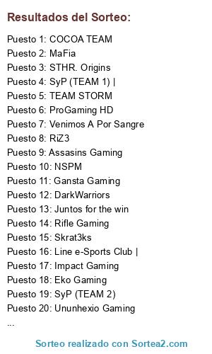 Lista de participantes: ProDestruction HD, Rifle Gaming, Royal e-Sports Club, DarkWarriors, ProGaming HD, COCOA TEAM, Excelence Gaming, Eko Gaming, Skrat3ks, STHR. Origins, ANPS TEAM, Line e-Sports Club |, SyP (TEAM 2), Assasins Gaming, Venimos A Por Sangre, Juntos for the win, Impact Gaming, SyP (TEAM 1) |, MaFia, TEAM STORM, Gansta Gaming, Ununhexio Gaming, RiZ3, NSPM.