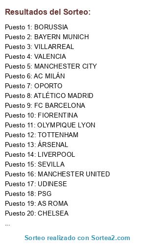 Lista de participantes: FC BARCELONA, MANCHESTER CITY, UDINESE, ÁRSENAL, BORUSSIA, NÁPOLES, MANCHESTER UNITED, REAL MADRID, ATLÉTICO MADRID, CHELSEA, VALENCIA, TOTTENHAM, FIORENTINA, LIVERPOOL, BAYERN MUNICH, AC MILÁN, PSG, INTER MILÁN, JUVENTUS, OLYMPIQUE LYON, SEVILLA, AS ROMA, OPORTO, VILLARREAL.