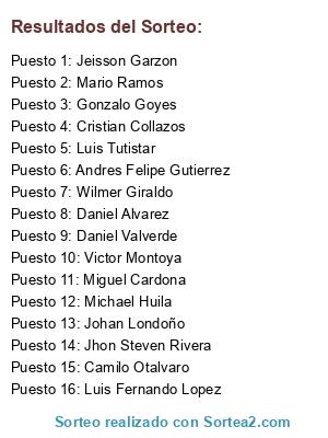 Lista de participantes: Andres Felipe Gutierrez, Michael Huila, Luis Fernando Lopez, Jhon Steven Rivera, Camilo Otalvaro, Johan Londoño, Victor Montoya, Mario Ramos, Daniel Alvarez, Gonzalo Goyes, Jeisson Garzon, Cristian Collazos, Daniel Valverde, Miguel Cardona, Luis Tutistar, Wilmer Giraldo.