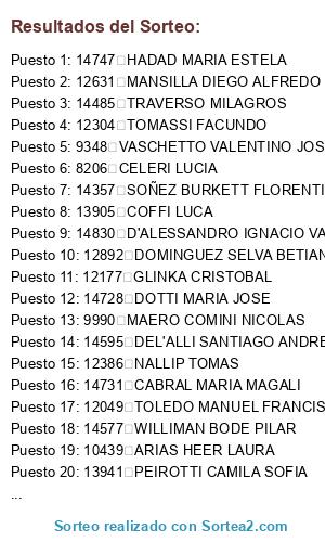 Lista de participantes: 5521 AAB MIRTA MABEL, 10350 ABRAHAM CAROLINA ZAMIRA, 7411 ACHKAR IGNACIO, 12823 ACHKAR JOAQUIN, 11043 ACHKAR PATRICIO, 12922 ACOSTA BENICIO GASTON, 14837 ACOSTA FEDERICO EMANUEL, 11905 ADJAD CATALINA, 13007 ADJAD DOLORES, 13017 ADJAD EMILIA, 13016 ADJAD FRANCISCO, 11894 ADJAD MILAGROS, 14214 AGU LOPEZ VALENTINO MARCELO, 10142 AGUIRRE NICOLAS ELIAS, 2612 AIELLO FRANCISCO ANTONIO, 14855 ALBARRACIN JOAQUIN, 14715 ALBIÑANA ADRIAN FRANCISCO, 13869 ALBIÑANA ALEJANDRO RAUL, 13871 ALBIÑANA FELIX IGNACIO, 13872 ALBIÑANA JUAN FRANCISCO, 13870 ALBIÑANA JUANA, 11646 ALBORNOZ BAUTISTA, 13798 ALBORNOZ LUCAS ARIEL, 12214 ALBORNOZ SOFIA, 13544 ALBORNOZ TOBIAS, 14716 ALE SAMIRA EVELIN, 12729 ALICANDRO GERARDO MARCELO, 11334 ALICANDRO VIVAS CATALINA, 13943 ALLENDE GUILLERMINA, 615 ALLENDE MARIANO, 8531 ALMAZAN SANDRA MARIEL, 642 ALOY BEATRIZ ANA, 14348 ALVAREZ AGUSTIN MATIAS, 14354 ALVAREZ JOAQUIN NICOLAS, 14347 ALVAREZ LAUTARO EXEQUIEL, 14786 ALVAREZ RUBEN DARIO, 14856 AMERISE VALENTINO, 10522 AMUT LEANDRO, 10912 ANDRIOTTI FRANCO, 397 ANTONIAZZI MARTIN FRANCISCO, 9399 ANTONIAZZI STEFANIA BELEN, 14733 ANTONIAZZI VALENTINO, 14474 ANTONINI FELIX, 13071 ANTONINI TOMAS VALENTIN, 12675 APRILE ALVARO, 14374 AQUINO DYLAN MICAEL, 13824 ARAGNO MARIA FERNANDA, 4821 ARCAS RAMIRO FEDERICO, 5547 ARDISANA GABRIELA, 3888 ARDISANA VIVIANA PATRICIA, 10439 ARIAS HEER LAURA, 13705 ARTEAGA MARIA LAURA, 3325 ARTIGUES JUAN RICARDO, 3339 ARTIGUES RODRIGO JAVIER, 10700 AVILA BAUTISTA, 10699 AVILA JAVIER GUSTAVO, 14669 BACHELLI MATEO, 13613 BAIALARDO MA. CAROLINA, 8190 BALBASTRO ALEJANDRO, 12902 BALBASTRO FACUNDO, 9480 BALBASTRO GUSTAVO CARLOS, 14397 BALESTRA CARMELA, 14505 BALLESTER JUAN BAUTISTA, 552 BANDE ORLANDO MANUEL, 13742 BAQUE VALENTIN, 14601 BARBOSA SANTIAGO, 14868 BARCELO MAITENA, 14725 BAROLIN FLORENCIA AGOSTINA, 455 BARREYRO TITO JOSE, 12966 BARRIOCANAL JOSE IGNACIO, 14361 BARRIOS COLMAN MARIANELA NAZARET, 13758 BARROS PILAR, 14759 BARSANTI EMILIO ANGEL, 14762 BASOK PEÑA MARTINO, 74 BATLLE CASAS BARBARA, 2528 BATLLE CASAS DANIELA, 1967 BATLLE CASAS NESTOR HUGO, 11464 BAY INDIANA MORA, 14530 BAY ITALO, 14531 BAY NAHUEL RENE, 14375 BAZZI FAUSTINO, 13408 BEAUGE MARIA EUGENIA, 14744 BECERRA JORGELINA, 12667 BECHIS EMILIA, 12685 BECHIS FLORENCIA, 12787 BELLEZZE MARIA LAURA, 7060 BELOSO DIFIORI MA.MICAELA, 12684 BELOTTI GUSTAVO DANIEL, 11415 BELOTTI JOAQUIN, 14411 BENITEZ LUCIA, 14418 BERARDO JUAN MARTIN, 14653 BERGALLO FACUNDO IGNACIO, 548 BERRON GRACIELA A., 12726 BERTA ROXANA BEATRIZ, 12151 BERTA SANDRA BETINA, 13611 BERTINI MARIA VERONICA, 6454 BERTONE LORENZO, 6453 BERTONE LUIS ALBERTO, 13195 BERTONE MALENA, 14445 BESSONE DANIEL ARIEL, 14231 BESSONE JULIANA CONSTANZA, 12233 BIANCO VERONICA SOLEDAD, 12700 BIERI VALENTIN, 1049 BISA LILIANA SUSANA, 13084 BLANCO JOSHUA, 10521 BLANK SMERLING SILVINA, 14687 BOIRA MARIA SOL, 11407 BOIX BAUTISTA, 11943 BOIX MARCELO ALEJANDRO, 10849 BONI PATRICIA DANIELA, 14788 BONINO SERGIO, 14791 BONO AGNONE ANALIA VIRGINIA, 14613 BONO ALEJO LUCAS JOSE, 13517 BORIGLIO ZIMMERMANN TIAGO, 14795 BORRA MERCEDES, 5454 BOSCHETTO LUCIA, 14874 BOTES XIMENA, 14839 BOTTA GARELLO LAUTARO, 7286 BOUKHRISS YOUSSEF, 13617 BOUKRHISS YASSMIN, 13650 BOURQUIN TOMAS, 13927 BRACALENTI TOMAS, 5784 BRACONE LORENA BEATRIZ, 788 BRASCO MARTIN, 13163 BRNCIC SILVINA ALEJANDRA, 625 BUSIEMI LAURA MA.S., 14680 BUSILACCHIO LOLA, 8381 BUSTAMANTE SILVIA GRACIELA, 14391 BUTTARO JUAN MARTIN, 14731 CABRAL MARIA MAGALI, 14353 CABRERA FELIPE, 14090 CALELLO FRANCESCO SEBASTIAN, 14824 CALLEN MERCEDES, 14052 CALOSSO RENATA, 14586 CAMBRONERO CATALINA AYELEN, 14018 CAMINOS GISELA ANAHI, 8656 CAMUSSI RAFAEL ROBERTO, 12847 CANALE SABRINA, 14345 CANARIO AGUSTIN MARCOS, 13290 CANAVESIO ABEL LUIS, 8389 CANCILLIERI CARLOS MARCELO, 151 CANCILLIERI CIBEL MARIA ALEJANDRA, 481 CANCILLIERI LUCIANO OCTAVIO, 6360 CANCILLIERI PATRICIO VALENTIN, 14083 CANDIOTI LEHMANN INES, 14356 CAPAFONS JUAN PABLO, 10877 CAPELLINO SOFIA, 14394 CAPOCCETTI FIORELLA, 14757 CAPOLUNGO JAVIER EDUARDO, 13264 CAPOLUNGO JOAQUIN, 13193 CAPOLUNGO RENATA, 14539 CAPOYA CAMILO, 12350 CAPOYA MANUELA, 11314 CAPPA ANGEL LUIS, 11316 CAPPA BAUTISTA, 10852 CAPPA TOMAS, 14237 CAPPELLETTI ULISES, 282 CAPRA RICARDO ELIAS, 11373 CARAVATTI SANTIAGO NICOLAS, 14681 CARBONE MORETTO VALENTINO, 12466 CARDENAL SARA, 14551 CARDONA JULIANO, 13846 CARDONA MARIO GABRIEL, 14429 CARDOSO MATIAS LUCIANO, 14204 CARDU MAURO FRANCISCO, 5108 CARLEN CARLOS MARIA, 13483 CARLESSI GUIGUET TOMAS, 14748 CARLETTI FEDERICO, 14035 CARLINO VICTORIA GUADALUPE, 8813 CARNAGHI BIANCA, 7171 CAROSSO AGUSTINA, 7170 CAROSSO CANDELA, 7172 CAROSSO CONRADO, 2866 CARRASCO MARIA SOL, 3691 CARRASCO TOMAS, 13718 CASABLANCA JUAN CRUZ, 14866 CASAFUS ELION MAXIMO I, 10438 CASSANELLO ARIAS FRANCISCO, 12809 CASSANELLO ARIAS INES, 12808 CASSANELLO MARTIN, 8405 CASTAÑEDA JUAN MANUEL, 13229 CASTRO ALEMAN MARIA ANTONIA, 14384 CATALDO OCTAVIO, 12907 CATTANEO AMPARO MELBA, 10464 CATTANEO FACUNDO, 11470 CATTANEO MANUEL ANTONIO, 10479 CATTANEO PEDRO, 12307 CAVALIE MARIA INES, 1976 CAVALLERO ADRIANA, 5646 CECCATO PATRICIA MARCELA, 8205 CELERI AGUSTINA, 8206 CELERI LUCIA, 12015 CENTENO LARA MARTINA, 14205 CHANSARD VICENTE LEON, 14521 CHAYLE TOCHI URIEL NICOLAS, 14793 CHEHADE LUCAS KHALIL, 14010 CHERRI LAUTARO, 14188 CHIODINI TOMAS, 14506 CHIOVETTA ANDRES, 14835 CHIZZINI ANA PAULA, 12160 CIAN CLAUDIO ANDRES, 12158 CIAN JULIETA AGUSTINA, 12159 CIAN PAULINA ANABELLA, 2578 CISNEROS LAURA ALEJANDRA, 14514 CITRONI JOSE ANTONIO, 14515 CITRONI NIOI LUISA, 14488 CLEMENT SANTIAGO, 13905 COFFI LUCA, 14342 COLLOSA HADAD BENICIO, 13956 COMETTO NICOLAS ANDRES, 14831 CORAZZA GENNARO, 14809 CORAZZA SANTINO, 12488 CORDA LARA JULIETA, 14608 CORDOBA BENASSI CRISTOBAL, 13972 CORDOBA MARTIN FABRICIO, 13784 CORREA AMPARO, 14850 CORTI VICENTE, 13263 COSCIO GUILLERMINA, 6539 COSOLITO FRANCO, 8873 COSOLITO LUCIO, 13561 COSTA JULIAN, 13777 COSTABILE EMILIANO GABRIEL, 13778 COSTABILE FRANCISCO NESTOR, 4139 CRESPI GASPAROTTI JULIANA, 14398 CRI