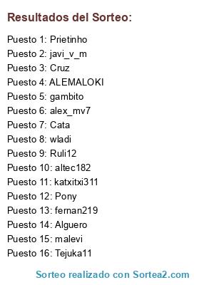Lista de participantes: gambito, javi_v_m, alex_mv7, wladi, altec182, ALEMALOKI, Prietinho, Cruz, Alguero, Ruli12, katxitxi311, Pony, fernan219, Tejuka11, malevi, Cata.