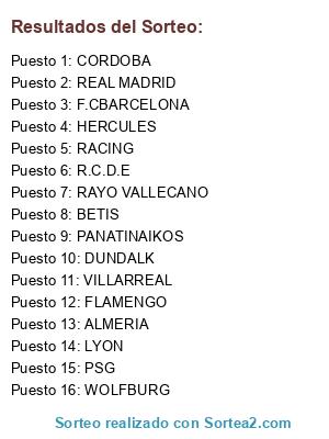 Lista de participantes: REAL MADRID, F.CBARCELONA, FLAMENGO, DUNDALK, WOLFBURG, ALMERIA, BETIS, CORDOBA, LYON, R.C.D.E, RACING, RAYO VALLECANO, HERCULES, PSG, VILLARREAL, PANATINAIKOS.