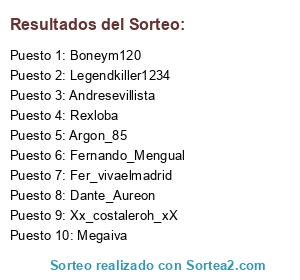 Lista de participantes: Andresevillista, Boneym120, Dante_Aureon, Argon_85, Fer_vivaelmadrid, Legendkiller1234, Megaiva, Rexloba, Xx_costaleroh_xX, Fernando_Mengual.