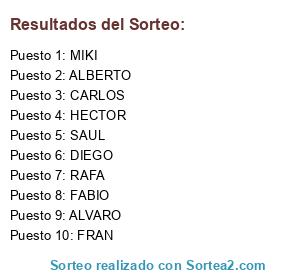 Lista de participantes: ALBERTO, ALVARO, CARLOS, DIEGO, FABIO, FRAN, HECTOR, MIKI, RAFA, SAUL.