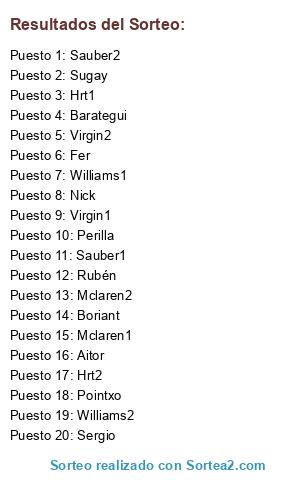 Lista de participantes: Sugay, Nick, Fer, Aitor, Barategui, Sergio, Perilla, Pointxo, Boriant, Rubén, Mclaren1, Sauber2, Virgin1, Hrt1, Mclaren2, Virgin2, Hrt2, Sauber1, Williams1, Williams2.