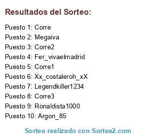 Lista de participantes: Argon_85, Fer_vivaelmadrid, Legendkiller1234, Megaiva, Ronaldista1000, Xx_costaleroh_xX, Corre, Corre1, Corre2, Corre3.