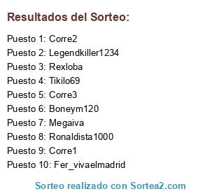 Lista de participantes: Tikilo69, Fer_vivaelmadrid, Legendkiller1234, Megaiva, Rexloba, Ronaldista1000, Boneym120, Corre1, Corre2, Corre3.