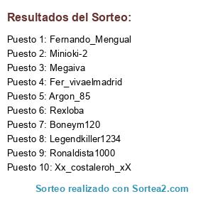 Lista de participantes: Legendkiller1234, Argon_85, Boneym120, Minioki-2, Rexloba, Megaiva, Xx_costaleroh_xX, Ronaldista1000, Fernando_Mengual, Fer_vivaelmadrid.
