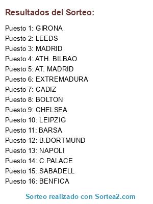 Lista de participantes: BENFICA, MADRID, GIRONA, LEIPZIG, CHELSEA, NAPOLI, LEEDS, EXTREMADURA, BOLTON, BARSA, AT. MADRID, ATH. BILBAO, C.PALACE, SABADELL, B.DORTMUND, CADIZ.