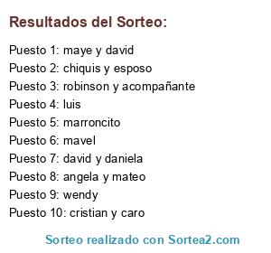 Lista de participantes: robinson y acompañante, luis, maye y david, cristian y caro, angela y mateo, chiquis y esposo, mavel, marroncito, wendy, david y daniela.