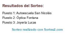 Lista de participantes: Óptica Algar, Herbodietética, Joyería Cuello, Mi móvil online, Óptica Fontana, Narima New, Mesón La Barra, Autoescuela San Nicolás, RcM electrodomésticos, RcM servicios, Mobydick, La Locura, Librería Liarte, Joyería Lucas, La frutería, Los churrascos.
