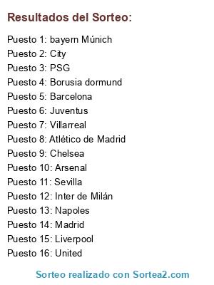 Lista de participantes: Villarreal, Madrid, Sevilla, Barcelona, Atlético de Madrid, PSG, bayern Múnich, Borusia dormund, City, United, Arsenal, Chelsea, Liverpool, Juventus, Inter de Milán, Napoles.