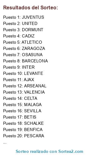Lista de participantes: BARCELONA, ZARAGOZA, SEVILLA, GIRONA, MADRID, BENFICA, DORMUNT, OSASUNA, LAS PALMAS, SAN LORENZO, PSG, JUVENTUS, VALENCIA, CHELSEA, MILAN, PESCARA, AJAX, BETIS, LIVERPOOL, REAL SOCIEDAD, ARSEANAL, BOCA, DEPORTIVO, REUS, MALAGA, CADIZ, SCHALKE, UNITED, LEVANTE, CELTA, INTER, ATLETICO.