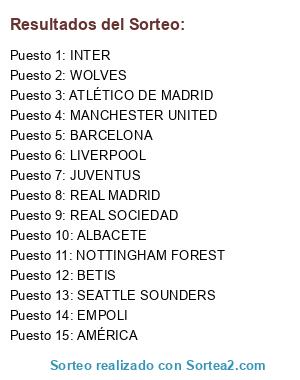Lista de participantes: ALBACETE, AMÉRICA, EMPOLI, ATLÉTICO DE MADRID, BARCELONA, BETIS, INTER, JUVENTUS, LIVERPOOL, MANCHESTER UNITED, NOTTINGHAM FOREST, REAL MADRID, REAL SOCIEDAD, SEATTLE SOUNDERS, WOLVES.