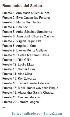 Lista de participantes: Alberto Soto , Paolo Sebastian Fernandez Zegarra , Milena Torres , Jomara Magno , Mayra Isabel Roman , Juan José Cáceres Castillo, Martin Hernández , Alee Ulloa , Merli Lucero Coveñas Erique , Angela Li Cao , Cristina Moreno, Humberto Saldarriaga, Somer Silva , Nerich Mar , Javier Pinedo Alderete , Milagroz Guadalupe , Kevin Carhuas , Hector Villa , Silhi Ursula Sagarvinaga , Evelyn Meniz Arellano , Gaby Meniz , Ana Maria Quichua Inca , Anita Sánchez Sanchoma , Kor Edwardx , María Saavedra , Wendy Saba , Ronald Gutiérrez Pardo , Virginia Taipe Yika , Alexandra García Chávez , Cefas Marreros Davila , Carlos Gonzales, Keyla Marreros Dávila, Julio Alfonso Cabanillas, Rita Céliz, Leslie Eliza, Bao Lee, Marisela Durán Grance, Elvis Cabanillas Fortuna, Bianca Dávila Maje, Iván Cautivo.