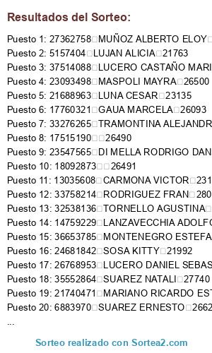 Lista de participantes: 27900976 ACOSTA CARLA 19984, 23849043 ACOSTA MARTINEZ ADRIAN 19202, 31028999 ACUÑA JUAN 23155, 25091418 AGNELLO ESTEBAN 25596, 37516895 BATATO ( KACHIVACHIS) 29626, 14311539 ALVAREZ GUSTAVO 19378, 23210927 ALVAREZ CELESTE 24526, 92821529 ALVAREZ ROJAS EDITH 23400, 92821528 ALVAREZ ROJAS FRANCISCO 23154, 92629325 ALVO COSSORO DAVID 25841, 32352349 AMORES SARA 24518, 31869712 ANA ISMAEL 22401, 34279338 ANCONETANI MELISA 28709, 22941540 GUILLE 19607, 92677068 ANDRADE CARINA 29284, 26314937 ARENAS HORACIO 23546, 31643809 ANTINORI RUBEN EDUARDO 22192, 20114053 ARISTIARAN GUSTAVO SERGIO 20280, 16059391 ARROJO VICTOR 10049, 16588702 ARUJ ALEJANDRO 24516, 22755918 ASTORGA MAURICIO DAVID 22213, 8239090 26502, 24370492 ATENCIO NURIA 27735, 39241591 AUGUSTO THE LOOPE 29288, 25628385 AYBAR LOURDES 19795, 16459246 AYE DANIEL 24692, 34747716 BACA CRISTIAN LUCIANO 27678, 28228092 BAIGORRI MARTIN 23544, 36964029 BARRERA PALOMA RAYEN 26072, 20563376 BARROS DANY 19609, 14040583 BASSANI DANIEL 25023, 34257541 BATTISTINI LULI 26494, 35627961 BAZAN PONTONII LUCAS 24512, 37135827 JAZMIN LAGARD 29625, 34447206 BELBRUNO VARAS DAIANA 23409, 17021649 BENAVENTOS RAUL 22543, 14992473 EL PAYASO PEPITO 28057, 38208779 EVELYN JANET 28046, 30385665 BENDELE GONZALO 28569, 27062135 BENEGAS CHARO 23669, 25272636 BENINGAZZA LAURA PAOLA 26623, 39376429 BENITEZ ERICA 28544, 31028475 BERLANGA NICOLAS MATIAS 29613, 30926629 28472, 22625166 BERNAL VICTORIA 19203, 28690255 BERRIOS BUSTOS GABRIELA ALEJANDRA 27686, 11629160 BISMACH CRISTINA 22175, 18063504 BIZON GABY 25059, 3700032 BLANC RIBO ANA 25014, 20111663 BLANCO CONFORTI M. LAURA 26069, 12138721 BLANCO MARIA GLADYS 24581, 10586498 BOGGIA DARDO 23532, 17621330 BOIN LEONEL 25009, 14744855 BOMBAL JOSE MARIA 26453, 35184062 BONOLDI RUFENER FEDERICA 23152, 29914590 BORA NELLA 22203, 35265375 BOTI TEALDO GUIDO 29004, 30343917 BRAVO DAVID 23131, 6373865 CARRERA MARIU 10499, 27759058 BUCCI CRISTIAN 25592, 31285076 BUSTOS CARLOS 23132, 30179414 DANYEL 22204, 39181214 ALEJANDRO MAC 29627, 16088398 CACERES ROBERTO 19897, 33303297 ROMERO DAY ANELEY 27717, 12264859 CALDERON MIGUEL A 10053, 27192966 CALDERON MIGUEL ANGEL 24698, 26041357 CALDERON RODRIGO ANDRES 21215, 35661809 CALIFANO JUAN ANTONIO 25845, 31286604 CALLE FABIAN 26497, 31106813 CAMPANELLO FLORA 25060, 31247292 28444, 23905173 CANO GUSTAVO 22414, 12276067 CAPARA CECILIA 19794, 16474305 CAPURRO CARLOS 19792, 14428484 CARDINALI CRISTI 25008, 34015937 CARDONA ROCIO 29199, 20424147 CARMONA CROCE ALBERTO 24697, 13035608 CARMONA VICTOR 23134, 32974910 CARNERO MARIA GUADALUPE 23410, 24192429 CAROFF CECILIA 19216, 39534860 CAROL STHEFANI BELEN 27742, 95510303 CARRASCO MELISA 28710, 94187070 CARRASCO MONTERRICHARD FRANCIS 19207, 18081282 CASANOVA GUSTAVO 19337, 13569129 CASARES ALICIA 25015, 29875568 CASTILLO MAXI 23398, 30242670 28711, 35662323 CASTRO CRISTIAN ALEJANDRO 29285, 22189692 ANDRE MARCELO 24509, 18453290 CESPEDES GABRIELA 19375, 32019367 CESPEDES RIFLE 23399, 18521940 CHALES FABIAN OSCAR 25041, 18446535 CHAMPANE ROSANA 28047, 30274720 CHIFANI JUAN MANUEL 25786, 37518124 CHIRINO GONZALO DAVID 28553, 26073306 CHRISTEN PATRICIA 19209, 13716991 CINQUEMANI JUANJO 25029, 14032994 CLAVIJO GLADYS RUIZ 28554, 24925595 COMOTTI JUAN CRISTOBAL 19338, 18389279 CONTE ALEJANDRO 21345, 33275770 CONTE MARIA ANTONELLA 23418, 24634402 CONTRERAS PEDRO SERGIO 21106, 28134023 CORAZZA VANINA ANALIA 23620, 30418363 CORIA CRISTIAN RAUL 22174, 34113981 CORIA ROMINA KARINA 24508, 95104090 CORNEJO ISABEL 29283, 35936416 29292, 38579410 CORONEL WILTON 29006, 33577949 CORREA MAXIMILIANO LAIR 28322, 28443835 CORTEZ ANDREA 22205, 38909681 CORTEZ DINO 28056, 28024251 CORTEZ MAXIMILIANO 26456, 11487948 CORTEZ NANCY GLADYS 26454, 4115997 CORTOPASSI ELSA 24510, 36735002 CORZO LUCAS RODRIGO 25787, 23831614 CREDEDIO KARINA CECILIA 27685, 17246540 CRUZ HERNAN 21343, 30536416 CUBILLOS MARGARITA 21210, 29341184 NEMESIS DRAEQUEEN 21219, 32455546 DAGUERRE AGUSTIN 23145, 37622340 DE LUCIA GONZALEZ JOAQUIN 25040, 12008379 DE MONTE SONNIA 11615, 6415305 DEL BARRIO LUISA ELBA 24669, 14508909 DEL CASTILLO SILVIA 19402, 42913556 DEPUTAT ANTON 28547, 36592083 DI LAUDO GUARINI DARIO MARTIN 28566, 12187786 DI MARCO LI 18960, 23547565 DI MELLA RODRIGO DANIEL 19149, 24917596 DI RAIMONDO MARIA VICTORIA 25028, 24087473 DIAZ CARLOS HORACIO 22548, 36417233 DIAZ MARIA ELINA 27719, 32879290 DIBLASI MARA 23137, 23377265 NOLCIC EDUARDO 26499, 25739010 DOLZ SEBASTIAN 22402, 28627447 DOMINGUEZ MATIAS (MENDOZA) 20946, 13912900 DONA MARIA FLAVIANA 27721, 33051443 LULA 26452, 22059716 HERRERA WALTER 27736, 36859912 DUARTE LUJAN 24674, 32812283 ECHEGARAY JESSICA 24580, 29834672 ELMELAJ MARIA JOSE 25033, 21809099 ENCINAS CARLOS DANIEL 27723, 40369025 ESPEJO FERNANDA 28542, 14311203 ESPINA VICTOR JOSE 16590, 17389953 DANA 26495, 17515190 26490, 20728278 FALCO SILVINA 21105, 22900816 FALCON JAVIER GRIEGO 24582, 24705471 FALCON VIOLETA 19192, 10803172 FARIAS ALEJANDRO 28548, 27402233 FAVARI JUAN PABLO 19347, 113080784 FERNANDEZ BARRANTES BRENDA 25844, 17177682 FERNANDEZ RICARDO 25012, 32162946 FISELA ROMINA 23394, 32360611 FLORES CINTHIA SOLEDAD 21984, 28399266 FLORES DIEGO 24532, 23893083 FLORES JORGELINA 19345, 29617879 FLORES JUAN AUGUSTO 21983, 28225467 FLORES NOELIA SOLEDAD 21982, 17621228 FOLKENAND ANDREA 28545, 6906843 FORNES JORGE 6464, 24946281 FRESINA MARIANA 19024, 36252900 LECHU 26496, 30924322 FUNES MAURICIO 23140, 28220031 GABRIELLI POQUET NATACHA 21981, 37125032 GALLAR EMANUEL 25141, 14185363 GALLARDO ROBERTO 24696, 30674473 ZORRO GALVEZ 29615, 6885042 GALVEZ HUGO 8586, 21986621 TITERES KAPAIEIE 27724, 27785288 GARCIA GUILLERMO 23543, 33362943 GARCIA MANZANO ANA JOSEFINA 22399, 24746089 GARRO GABRIELA 19189, 17760321 GAUA MARCELA 26093, 23840601 GENTILE JULIETA 21755, 13085469 GHILARDI SILVIA 22172, 32851472 GIMENEZ FEDERICO NICOLAS 29178, 36859279 GIMENEZ LORENZO AGUSTIN 25784, 26339790 GIORGI MARIA HELENA 21756, 12138686 GIORGIO MARISA AURORA 26082, 1
