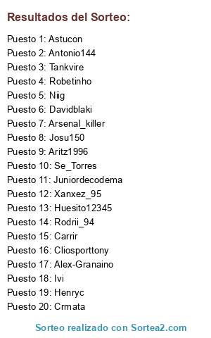 Lista de participantes: Alex-Granaino, Rodrii_94, Huesito12345, Aritz1996, Ivi, Niig, Robetinho, Crmata, Juniordecodema, Josu150, Antonio144, Davidblaki, Tankvire, Se_Torres, Cliosporttony, Xanxez_95, Henryc, Astucon, Carrir, Arsenal_killer.