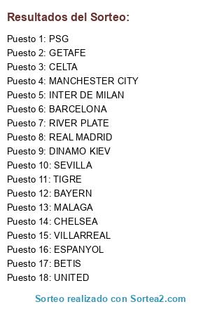 Lista de participantes: MANCHESTER CITY, RIVER PLATE, INTER DE MILAN, VILLARREAL, GETAFE, BARCELONA, TIGRE, REAL MADRID, BAYERN, DINAMO KIEV, SEVILLA, UNITED, ESPANYOL, PSG, CHELSEA, MALAGA, BETIS, CELTA.