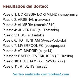 Lista de participantes: LIVERPOOL FC (pacopaquet), TOTTENHAM (AyozePodolski), ALMERIA (osorolo2310), PSG (alfitantalo), R. BETIS (wisa23), AT. MADRID (puga14), JUVENTUS (el_Thatanka), ARSENAL (renovac), FULLHAM (Xx_RaYcO_xX7), BORUSSIA DORTMUND (ismaeljimva), BAYER LEVERKUSEN (El_Troska).