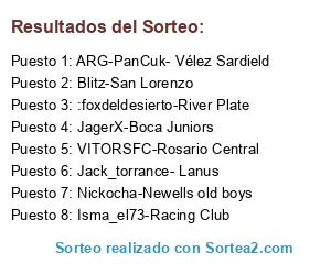 Lista de participantes: VITORSFC-Rosario Central, Nickocha-Newells old boys, Blitz-San Lorenzo, Isma_el73-Racing Club, Jack_torrance- Lanus, JagerX-Boca Juniors, :foxdeldesierto-River Plate, ARG-PanCuk- Vélez Sardield.