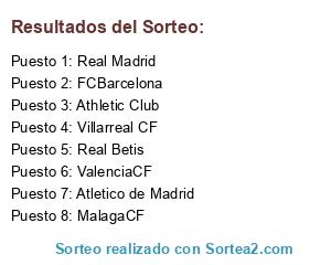 Lista de participantes: Real Madrid, FCBarcelona, Athletic Club, ValenciaCF, MalagaCF, Real Betis, Villarreal CF, Atletico de Madrid.