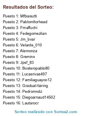 Lista de participantes: Mfbiasutti, Jpsf_83, Lautarocr, Alemonza, Pedromndz, Greminx, Fedegomezlian, Lucasrivas497, Pablomltorhead, Familiaguayoo12, Velarde_010, Gradual-fairing, Jm_bvar, Diegoarnaud14502, Fmaffuchi, Bosteropablo80.