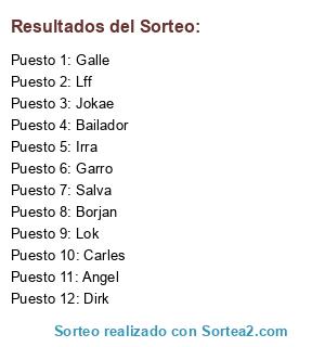 Lista de participantes: Dirk, Salva, Lok, Garro, Irra, Galle, Carles, Lff, Jokae, Angel, Bailador, Borjan.