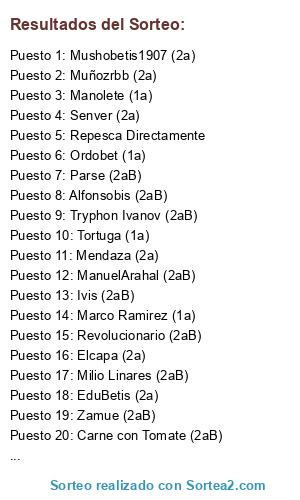 Lista de participantes: Wild (1a), Lembo (1a), German (1a), Tortuga (1a), Nacho Mtnez (1a), Maestroo (1a), Manolete (1a), Ordobet (1a), 19Dani07 (1a), Jlas (1a), Alvaro (1a), Marco Ramirez (1a), Crocantis (2a), Mendaza (2a), Garp (2a), Ajocana (2a), JuanpeBarna (2a), JmJota (2a), Elcapa (2a), Barksdale (2a), Pablo Romo (2a), EduBetis (2a), Skholer (2a), Teskiya (2aB), Quitanieves (2aB), Ajora (2aB), Zamue (2aB), Desege (2aB), Pichichi Molina (2aB), Carne con Tomate (2aB), Niuzerus (2aB), Tryphon Ivanov (2aB), Vesp (2aB), Frajua (2aB), PakoBetico (2aB), Fernanbetico (2aB), Medu23 (2aB), ManuelArahal (2aB), Betissss (2aB), Alfonsobis (2aB), Revolucionario (2aB), Vitillo (2aB), Dani Almenara (2aB), Ivis (2aB), Mpl29 (2aB), Parse (2aB), NKO (2aB), Humphrey Bogarth (2aB), Milio Linares (2aB), Beticon (2aB), Repesca Directamente, Senver (2a), Mushobetis1907 (2a), Muñozrbb (2a).