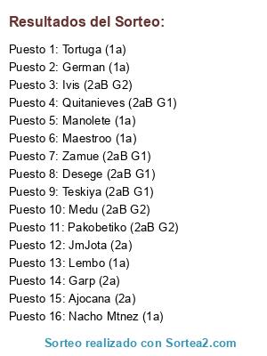 Lista de participantes: Quitanieves (2aB G1), Medu (2aB G2), German (1a), JmJota (2a), Garp (2a), Ajocana (2a), Desege (2aB G1), Manolete (1a), Nacho Mtnez (1a), Pakobetiko (2aB G2), Tortuga (1a), Teskiya (2aB G1), Zamue (2aB G1), Ivis (2aB G2), Maestroo (1a), Lembo (1a).