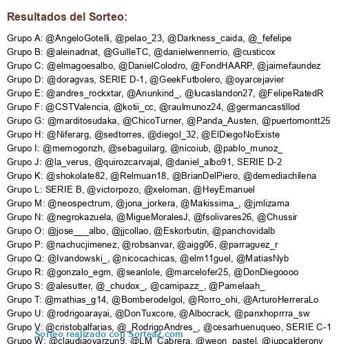 Lista de participantes: @_chudox_, @GeekFutbolero, @alejofloresq, @FondHAARP, @robsanvar, @alanedward_sw, @DiegoPinoDiaz, @DanielColodro, @Ivan_Viltor, @RodAC88, @andres_rockxtar, @Gmorales_9, @Matigoal_92, @alonsomanso, @Guaton_10, @ihoytsgf, SERIE B, @doragvas, @ramirescl, @memogonzh, @elm11guel, @NicoAndolini, @huntercl1, @chonet, @JMCandiaG, @demediachilena, @gonzhalinho, @rodrigoarayai, @Eskorbutin, @xeloman, @Bomberodelgol, @tataan7, @pablo_munoz_, SERIE C-1, @FMaquieira, @JorgeeIgnacioR, @g3rmansilva, @FelipeRatedR, @hperez91, @kotii_cc, @Niferarg, @nachucjimenez, @MatiasNyb, @neospectrum, @BalompieMundial, @Makissima_, @Albocrack, @v_pers0, @Pamelaah_, @Matiasdf, SERIE C-2, @germancastillod, @cristian_ug, @panchovidalb, @fcoalessandri, @TheSaint, @quirozcarvajal, @Wuares, @ZippoMontt, @Panda_Austen, @puertomontt25, @camipazz_, @viviandrea6, @claudiaoyarzun9, @aleinadnat, @danielwennerrio, @Anunkind_, @alesutter, SERIE D-1, @M_Hernandez_CC, @fsolivares26, @pelao_23, @Daniel_kraUC, @weon_pastel, @raulmunoz24, @mathias_g14, @iammemo_, @GuilleTC, @Hoogueeto, @crissepu_, @sedtorres, @ChicoTurner, @seanlole, @_RodrigoAndres_, @McBeegeeh_GB, @custicox, @JoainRock, @oyarcejavier, @la_dekingkong, @jose___albo, @yosoytuseguidor, SERIE D-2, @jona_jorkera, @BrianDelPiero, @segoas, @jjcollao, @nicoiub, @NachoOrtegaLDC, @jupcalderonv, @vodkaarandano, @nicocachicas, @DonDiegoooo, @gonzalo_egm, @_castroruz, @Relmuan18, @elmagoesalbo, @DonTuxcore, @GeraaldIgnacioo, @jaimefaundez, @marditosudaka, @tomasho5, @la_verus, @peterete2012, @sebarockinn, LIGA VECINAL BWN, @Karloitsme, @shokolate82, @Chussir, @FcoEnrique5, @victorpozo, @yerkoretamal, @parraguez_r, @lazzart, @maximunn, @Darkness_caida, @ely_espinoza, @ElDiegoNoExiste, @MigueMoralesJ, @Rorro_ohi, @hagasbar, @JFuenzalidaL, @CSTValencia, @marcelofer25, @LM_Cabrera, @FutbolChileno12, @diproxt, @panxhoprrra_sw, @andres_1986, @lucaslandon27, @diegol_32, @JannoRodriguez, @ConiBriss, @Pipopavez, @figueroanomas, @Ivandowski_, @lider_negativo, @DJTerroristah, @cesarhuenuqueo, @diegomolina1, @HeyEmanuel, @AngeloGotelli, @Roycronos, @DaniTripleA, @FranciscoYZ, @CamiloNicolas25, @sebaguilarg, @daniel_albo91, @cristobalfarias, @negrokazuela, @tono0206, @felix.morante, @fako, @ArturoHerreraLo, @jmlizama, @juantik, @aigg06, @_fefelipe.
