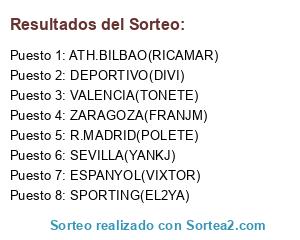 Lista de participantes: ATH.BILBAO(RICAMAR), R.MADRID(POLETE), SPORTING(EL2YA), ZARAGOZA(FRANJM), SEVILLA(YANKJ), VALENCIA(TONETE), ESPANYOL(VIXTOR), DEPORTIVO(DIVI).