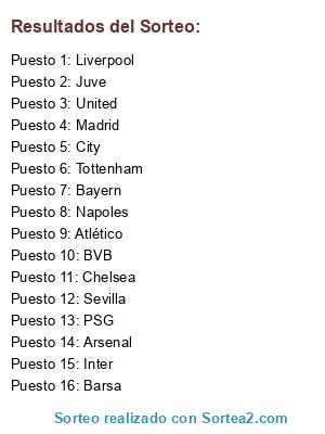 Lista de participantes: Madrid, Barsa, Atlético, Bayern, Juve, PSG, City, United, Chelsea, Arsenal, Tottenham, Liverpool, Napoles, Inter, Sevilla, BVB.