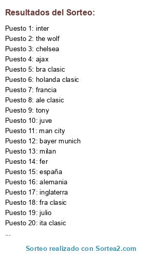 Lista de participantes: bra clasic, barcelona, the wolf, chelsea, españa, holanda clasic, fer, francia, man utd, carlos, fra clasic, liverpool, juve, bayer munich, arsenal, tony, ita clasic, ale clasic, italia, holanda, man city, brasil, ajax, real madrid, tavo, arg clasic, argentina, julio, inter, milan, alemania, inglaterra.