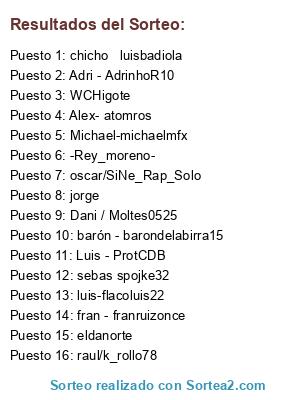 Lista de participantes: Alex- atomros, eldanorte, barón - barondelabirra15, chicho luisbadiola, WCHigote, luis-flacoluis22, Dani / Moltes0525, oscar/SiNe_Rap_Solo, raul/k_rollo78, Adri - AdrinhoR10, fran - franruizonce, -Rey_moreno-, sebas spojke32, Luis - ProtCDB, Michael-michaelmfx, jorge.