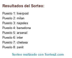 Lista de participantes: milan, napoles, inter, chelsea, zenit, barselona, arsenal, liverpool.