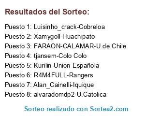 Lista de participantes: Luisinho_crack-Cobreloa, tjansem-Colo Colo, Kurilin-Union Española, R4M4FULL-Rangers, FARAON-CALAMAR-U.de Chile, alvaradomdp2-U.Catolica, Alan_Cainelli-Iquique, Xamygoll-Huachipato.