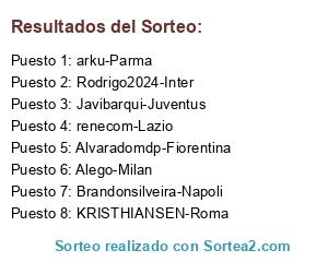 Lista de participantes: Brandonsilveira-Napoli, KRISTHIANSEN-Roma, arku-Parma, Javibarqui-Juventus, renecom-Lazio, Alvaradomdp-Fiorentina, Alego-Milan, Rodrigo2024-Inter.