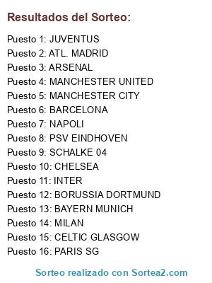 Lista de participantes: MANCHESTER CITY, SCHALKE 04, ATL. MADRID, BAYERN MUNICH, MANCHESTER UNITED, PARIS SG, NAPOLI, CHELSEA, BORUSSIA DORTMUND, PSV EINDHOVEN, BARCELONA, MILAN, INTER, CELTIC GLASGOW, JUVENTUS, ARSENAL.