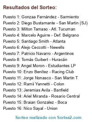 Lista de participantes: Marcelo Aguirre - Def. Belgrano, Jeremias Avila - Banfield, Milton Tamaso - Atl. Tucuman, Alejo Ceccotti - Newells, Braian Gonzalez - Boca, Ramii Yannetti - Colon, Jorge Nonasco - San Martin T, Patricio Navarro - Argentinos, Ariel Miranda - Rosario Central, Angel Moron - Estudiantes LP, Tomás Guibert - Huracán, Nico Sayal - Union, Gonzaa Fernández - Sarmiento, Diego Bustamante - San Martin (SJ), Enzo Benítez - Racing Club, Santiago Smith - Atlanta.