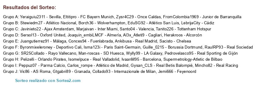 Lista de participantes: Isma123i - Paris Saint-Germain, Pedrovelasco95 - Real Sporting de Gijón, Gysan_CLS - Real Betis Balompié, Juangutierrez91 - Málaga, Yeraiguiu2311 - Sevilla, Joaquin_embiLMCF - Almería, Santo04 - Valencia, Pelizelli - Orlando Pirates, Carlos_rompe - Atlético de Madrid, Mincho82 - Real Racing, Zysr4C29 - Once Caldas, SR25Collado - Rayo Vallecano, IvaanM95 - Barcelona, Collado93 - Internazionale de Milan, Jemi666 - Feyenoord, Tanito226 - Tottenham Hotspur, Sersol13 - Oxford United, Vic86 - AS Roma, Peppuz07 - Parma Calcio, Stewiedm27 - Atlético Nacional, Sacisto - Chelsea, Isomelpuce - Real Valladolid, Byronmixeleroney - Deportivo Cali, FromColombia1969 - Junior de Barranquilla, Ankibusa - Real Madrid, Man-roscas - SD Huesca, Conces94 - Fuenlabrada, Javinieto22 - Ajax Amsterdam, LebrijaCity - Cádiz, Guille_0215 - Borussia Dortmund, Supermetrology-Atletic de Bilbao, Borch36 - Wolverhampton, Marjaivan - Inter Miami, RaulRP93 - Real Sociedad, Wylly99 - LA Galaxy, Herakroos - Alcorcón, EduSG92 - Atlético San Luis, Eltitipro - FC Bayern Munich, Gtgabri89 - Granada, Al3x_Atleti9 - Cagliari.