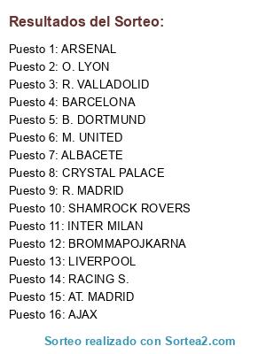 Lista de participantes: M. UNITED, R. VALLADOLID, RACING S., INTER MILAN, R. MADRID, O. LYON, ALBACETE, SHAMROCK ROVERS, BROMMAPOJKARNA, BARCELONA, AT. MADRID, ARSENAL, CRYSTAL PALACE, AJAX, B. DORTMUND, LIVERPOOL.