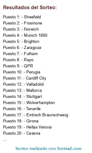 Lista de participantes: - Stuttgart, - Hannover, - Nuremberg, - Kaiserlautern, - Munich 1860, - Eintrach Braunschweig, - Bochum, - Newcastle, - Aston Villa, - Norwich, - Fulham, - Brighton, - Sheefield, - Nottingham Forest, - Leeds, - Wolverhampton, - QPR, - Levante, - Rayo, - Getafe, - Girona, - Valladolid, - Zaragoza, - Tenerife, - Mallorca, - Hellas Verona, - Carpi, - Bari, - Frosinone, - Cardiff City, - Cesena, - Perugia.