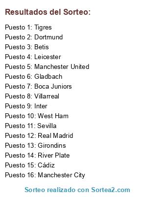 Lista de participantes: Tigres, Leicester, Manchester United, Real Madrid, Villarreal, Manchester City, Boca Juniors, Sevilla, Betis, Gladbach, Dortmund, Inter, Girondins, River Plate, West Ham, Cádiz.